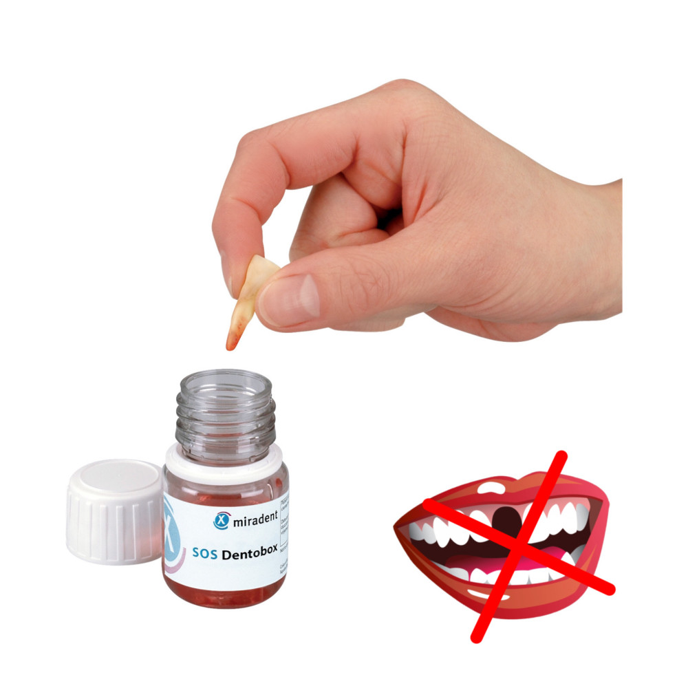 Nejlepší je mléko, slina pacienta, slaný fyziologický roztok, a to v tomto pořadí. V nouzi poslouží i samotná voda, která ačkoliv je velmi špatné médium, lepší cokoliv než mít zub na suchu.Buňky periodoncia na kořeni začnou odumírat již pár minut po začátku vysoušení zubního kořene. A právě ty a jejich vitalita je klíčová pro správné zahojení. Existují i speciální roztoky na uchovávání vyraženého zubu, které by měli být dostupné všude tam, kde úrazy hrozí více - bazény, zimní stadiony a jiná sportoviště.