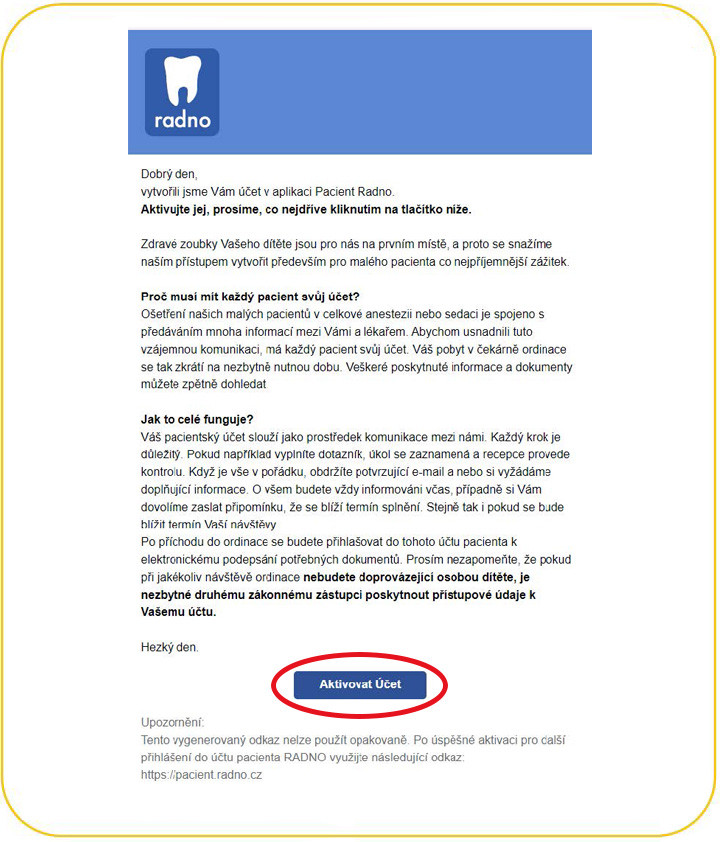 Pokud musíte další vyplňování údajů v pacientském účtu přerušit, pro příští přihlášení klikněte v komunikačním e-mailu na link pro přihlášení do účtu pacienta nebo na webové stránce www.radno.cz na tlačítko vpravo nahoře „Účet pacienta Radno“.